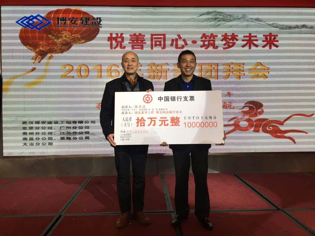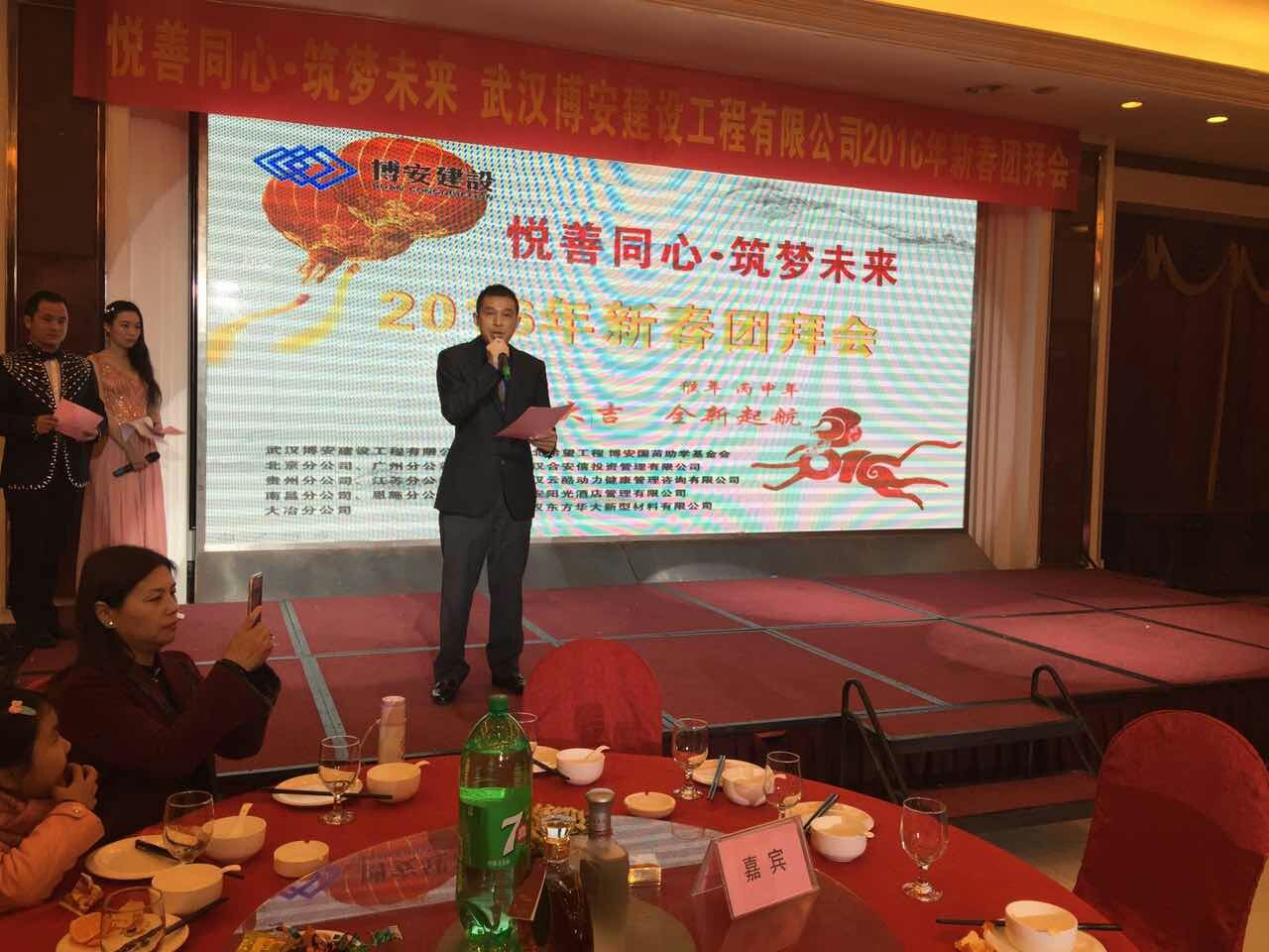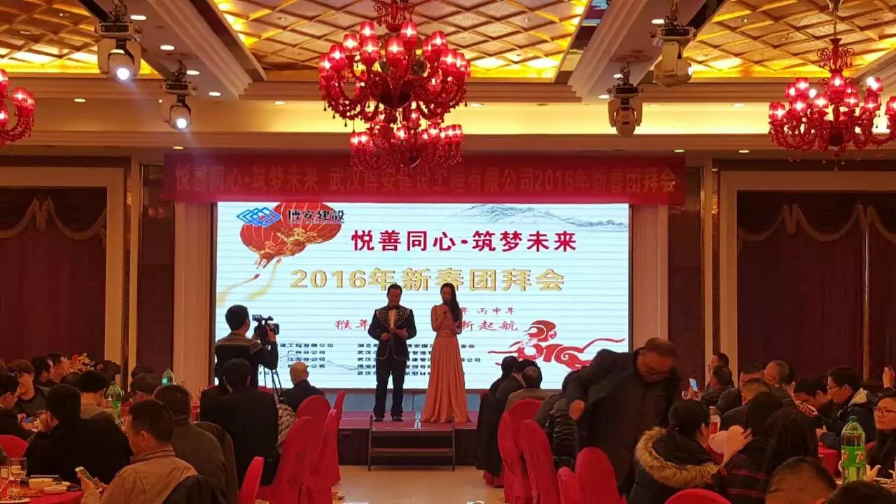 吉羊辭舊歲,金猴報春來。2月22日,值此中國傳統(tǒng)佳節(jié)元宵節(jié)到來之際,武漢博安建設工程有限公司2016年新春團拜會在武漢湘鄂情隆重召開。博安建設有限公司董事長熊善清、湖北省企業(yè)創(chuàng)新發(fā)展促進會執(zhí)行會長兼秘書長鄧君、武漢大學總裁班同學會會長張群等領導出席了團拜會,與公司員工歡聚一堂,喜迎新春,共謀發(fā)展。